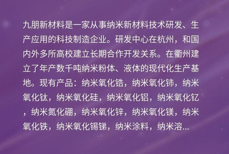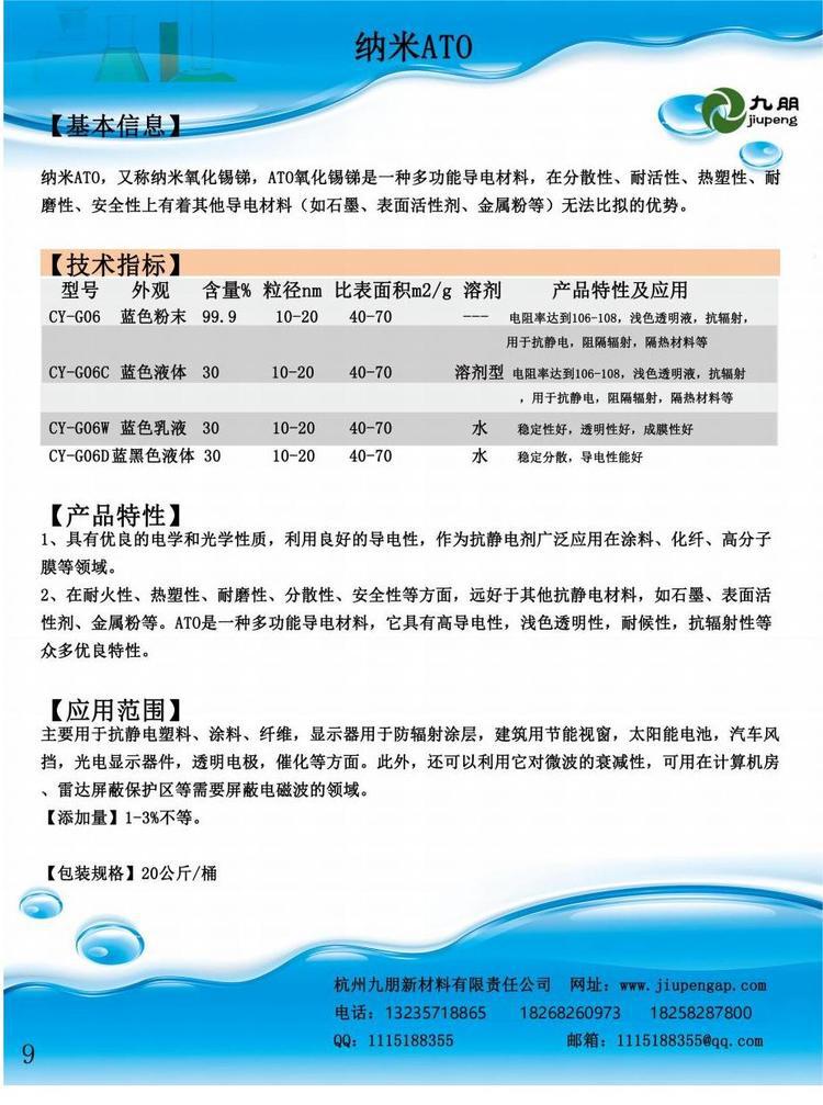 本网页所展示的有关【纳米ATO 氧化锡锑 抗静电 导电 辐射散热涂料】的信息/图片/参数等由会员【杭州九朋新材料有限责任公司 】提供,由久企达会员【杭州九朋新材料有限责任公司 】自行对信息/图片/参数等的真实性、准确性和合法性负责,本平台(本网站)仅提供展示服务,请谨慎交易,因交易而产生的法律关系及法律纠纷由您自行协商解决,本平台(本网站)对此不承担任何责任。您在本网页可以浏览【纳米ATO 氧化锡锑 抗静电 导电 辐射散热涂料】有关的信息/图片/价格等及提供 【纳米ATO 氧化锡锑 抗静电 导电 辐射散热涂料】的商家公司简介、联系方式等信息。