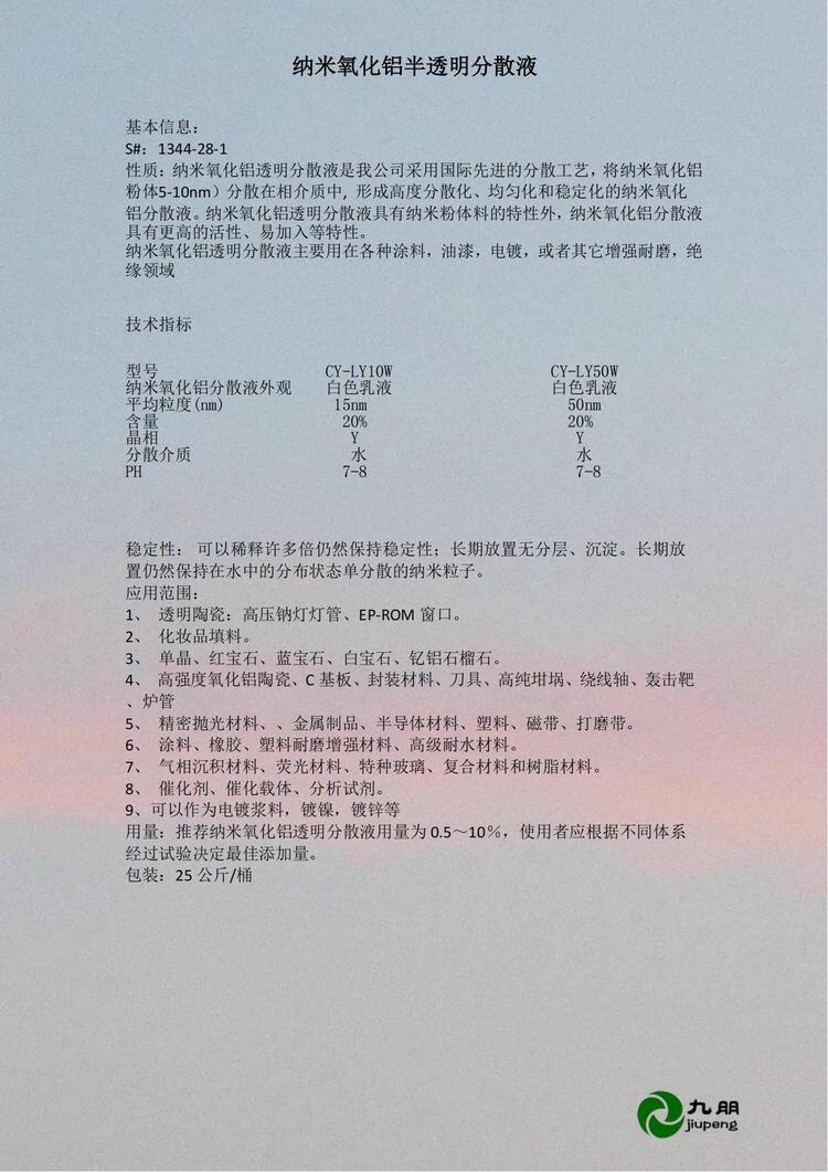本网页所展示的有关【九朋10 50纳米氧化铝水性分散液 伽马三氧化二铝液体】的信息/图片/参数等由会员【杭州九朋新材料有限责任公司 】提供,由久企达会员【杭州九朋新材料有限责任公司 】自行对信息/图片/参数等的真实性、准确性和合法性负责,本平台(本网站)仅提供展示服务,请谨慎交易,因交易而产生的法律关系及法律纠纷由您自行协商解决,本平台(本网站)对此不承担任何责任。您在本网页可以浏览【九朋10 50纳米氧化铝水性分散液 伽马三氧化二铝液体】有关的信息/图片/价格等及提供 【九朋10 50纳米氧化铝水性分散液 伽马三氧化二铝液体】的商家公司简介、联系方式等信息。