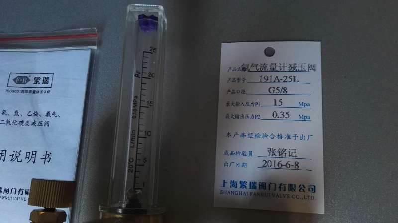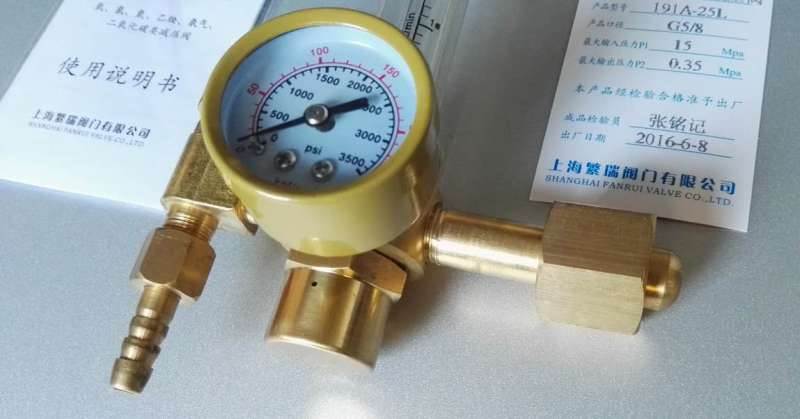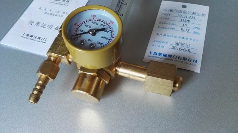 上海繁瑞阀门有限公司的生产191A-25L流量计式减压阀,输出压力稳定,密封性能好,使用方便。母体采用黄铜制造,出口螺纹M12X1RH(M)。适用于配管系统、实验室、MIG/TIG气体保护焊等场合的气体流量监视,流量计输入压力设定为0.35mpa,精度等级4级,方形保护罩使各面刻度更清晰易读,流量管和保护罩采用抗冲击复合材料制造,即安全又经久耐用。可用于各种高纯气体、医疗实验、仪表及分析、气相分析、电厂设备、石油化学工业、气体控制箱、吹扫系统、热处理设备、气体汇流排、有毒气体、半导体等行业的气体管路系统。